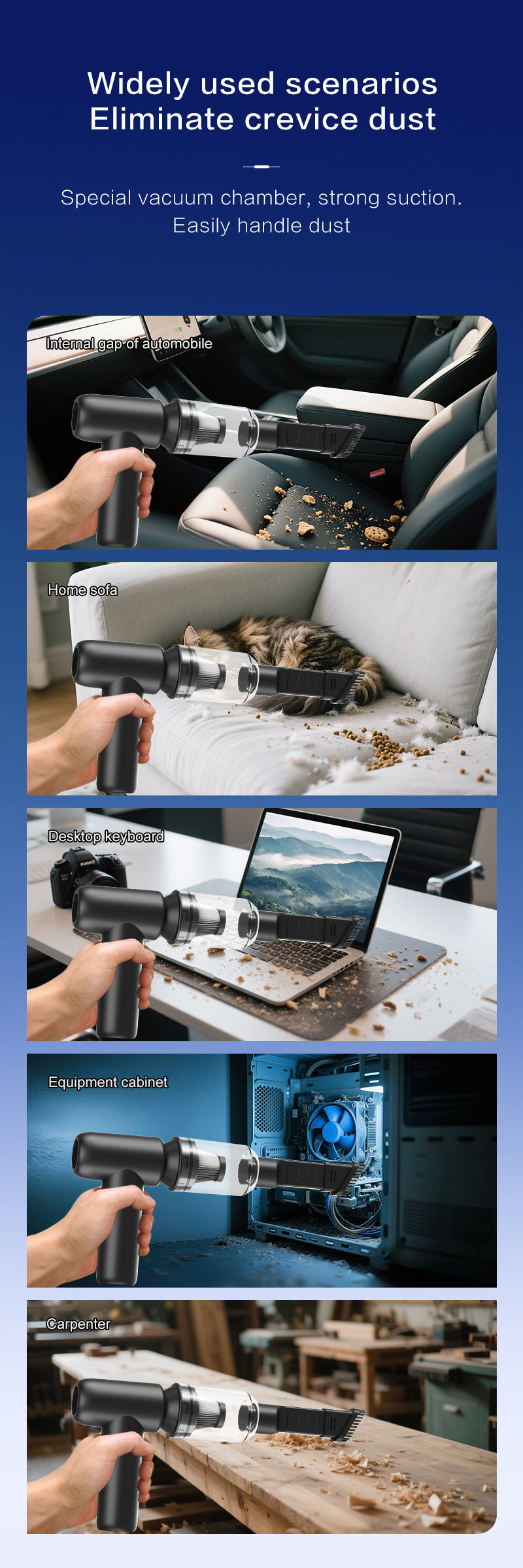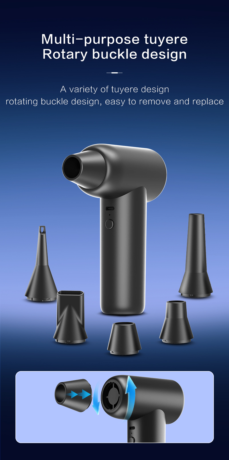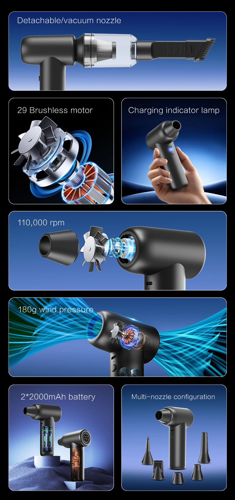 La velocità di rotazione ultraelevata di 110.000 giri/min consente una rimozione efficiente di detriti e polvere. La pressione dell'aria di 170 g garantisce una potente forza pulente, supportando la doppia funzionalità di aspirapolvere. Una batteria da 4000 mAh garantisce fino a 60 minuti di autonomia in prima velocità, per svolgere attività di pulizia flessibili. La costruzione in ABS con stampo privato garantisce la durevolezza del prodotto e una qualità superiore. La protezione dalle alte temperature a 75°C e la protezione dalle sovratensioni a 9V migliorano la sicurezza operativa. Numerose certificazioni internazionali (MD, MSDS, UAKC, PSE, ROHS, FCC, CE, UN38.3) convalidano l'affidabilità del prodotto.