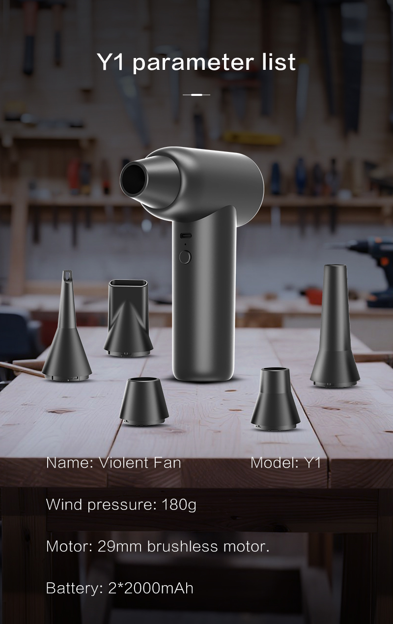 Realizzato in ABS stampato privato, con dimensioni di 158,64 cm (peso di 237 g ± 5 g), il ventilatore Violent vanta una potenza di 100 W, un ingresso di 5,4 V/75 W e una batteria da 4000 mAh (fino a 60 minuti di autonomia in prima marcia). Offre una velocità del vento di 41 m/s e una pressione dell'aria di 170 g, ideale per la pulizia di detriti/polvere e per l'uso come aspirapolvere. Con una temperatura di 75 °C e una protezione da sovratensione di 9 V, oltre alle certificazioni MD/MSDS/UAKC/PSE/ROHS/FCC/CE/UN38.3, garantisce prestazioni sicure e affidabili.